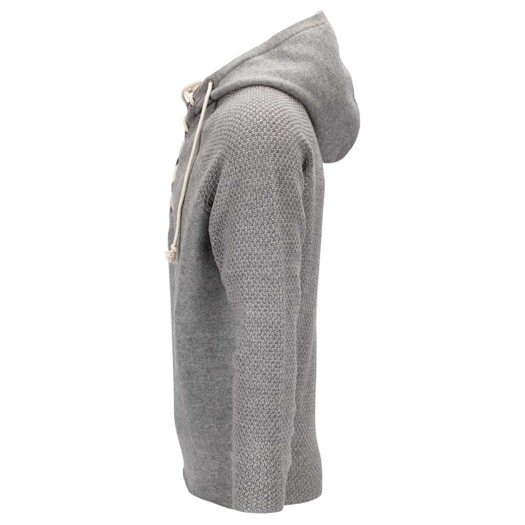 The standard brushed cotton or polyester fleece hoodie is all well and good, but when the mercury starts to drop, you’ll want something warmer and sturdier. The front and hood of this sweater are knitted oversize in soft, itch-free merino then boiled down to size, creating a uniquely weatherproof fabric that’s long been favoured by sailors and mountaineers. Moss stitch sleeves and back lend a subtle texture contrast to a durable garment that’ll keep you toasty for years to come, while the laced neck gives it a Viking feel – sort of like you might be toiling at the oar of a longship rather than sat at the wheel of the van or sipping a beer by the campfire.