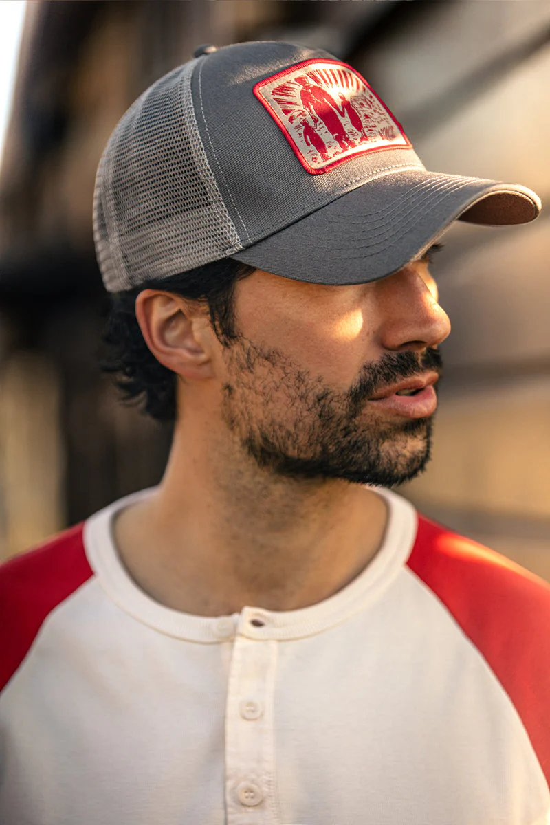 From the early 1930’s through to the 60’s truckers were given heavily branded peaked caps by the haulage companies and later by other brands as a way of promoting their businesses. Also known as mesh or net back caps, they gained notoriety through into the 70’s as global brands such as mountain few and agricultural feed companies used them as give aways at truck stops which is why they’re also known as gimme caps - ie. give me due to them being handed out for free. Fast forward over the 50’s and the trucker cap is the staple in ant denim heads wardrobe, still carrying the heavy branding, the net back and curved peak.